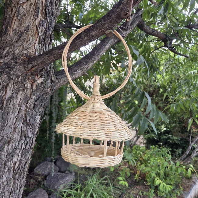 La corde est nouée à 3 points dans la clôture de la corbeille et attachée en haut avec un anneau en rotin. Ce qui permet de l'accrocher à un crochet