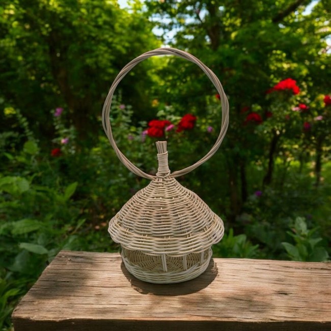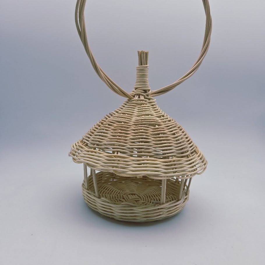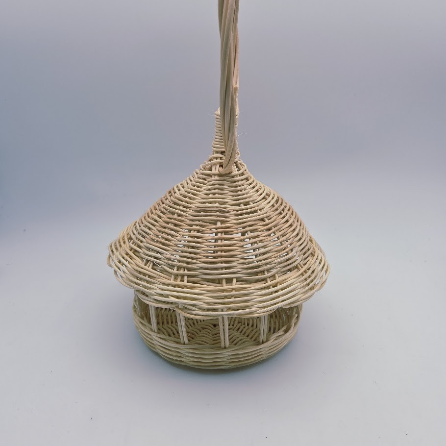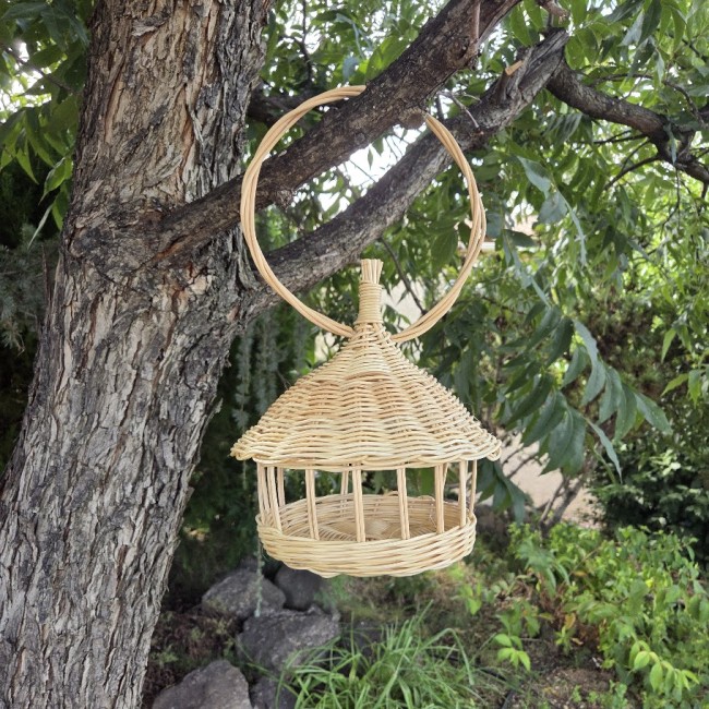 Cette mangeoire pour oiseaux en rotin naturel en forme de maisonnette a été entièrement fabriquée par mes soins.