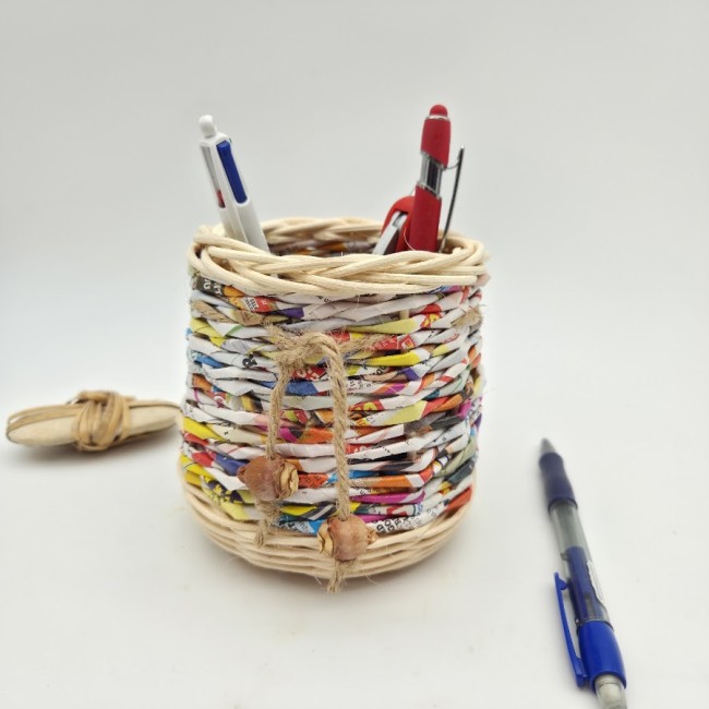 Ce pot à crayons - douillette à lunettes - télécommandes - est fabriqué en rotin naturel écru - papier magazine recyclé .