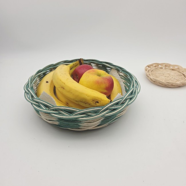 Un grand plateau et un petit vide-poche dans le même esprit, mariant la mosaique et la vannerie avec un contraste de brillant et de mat
