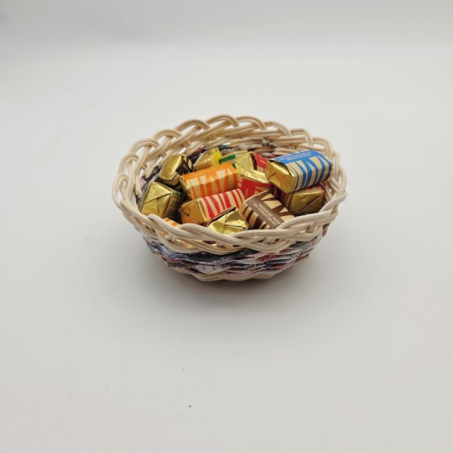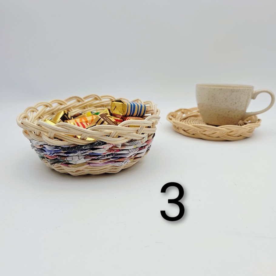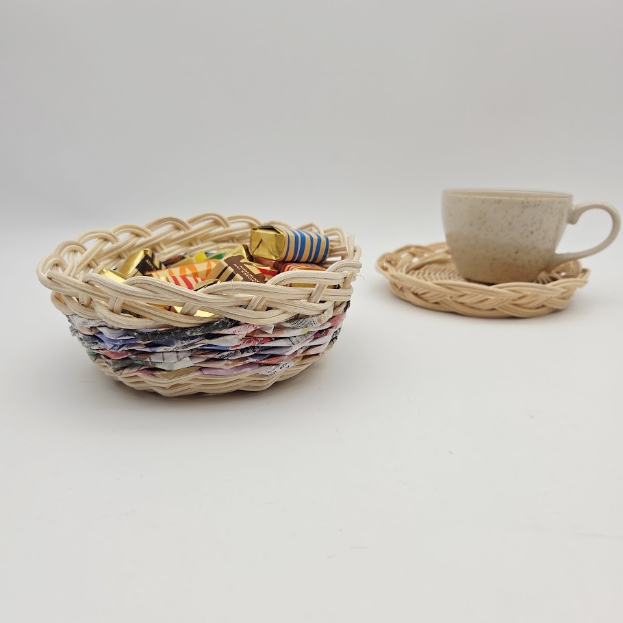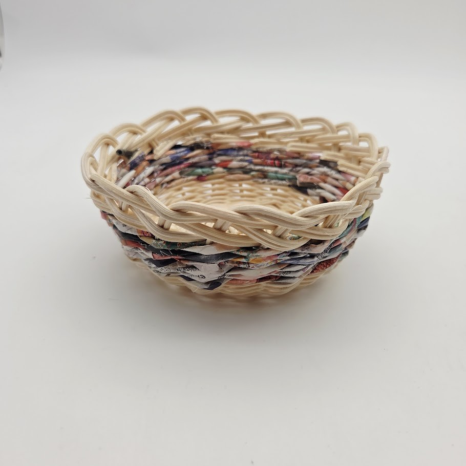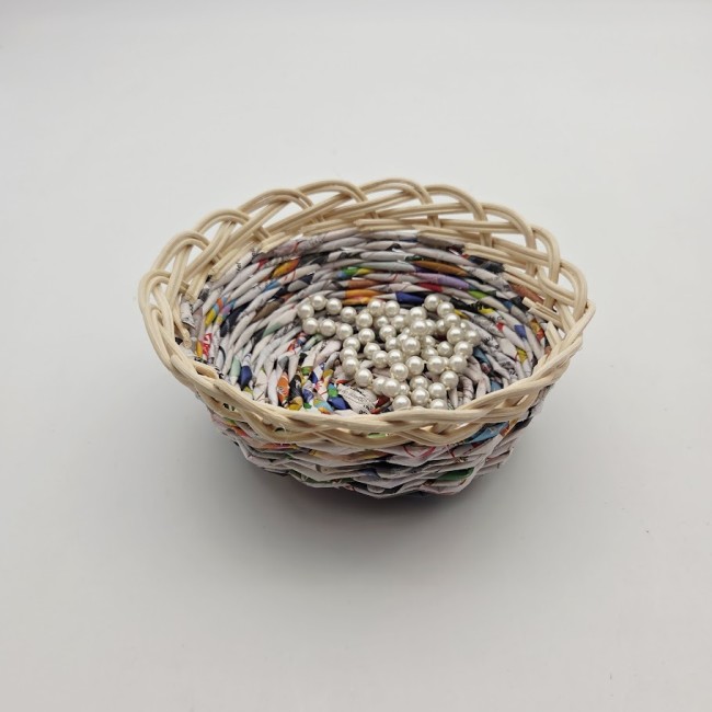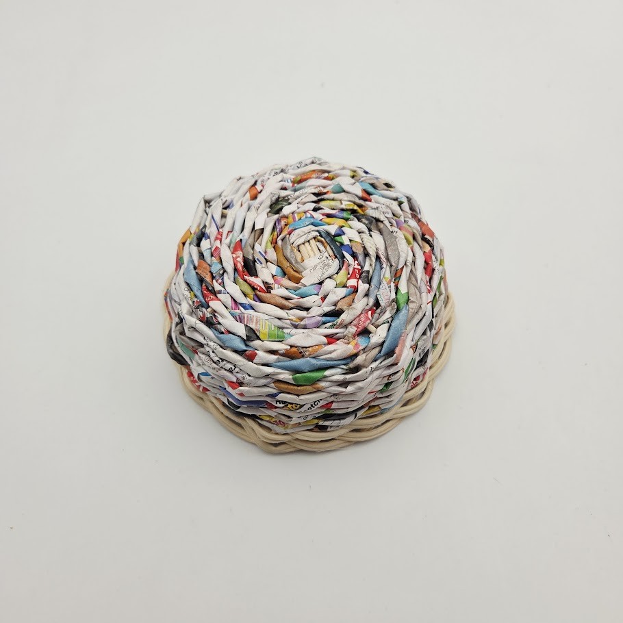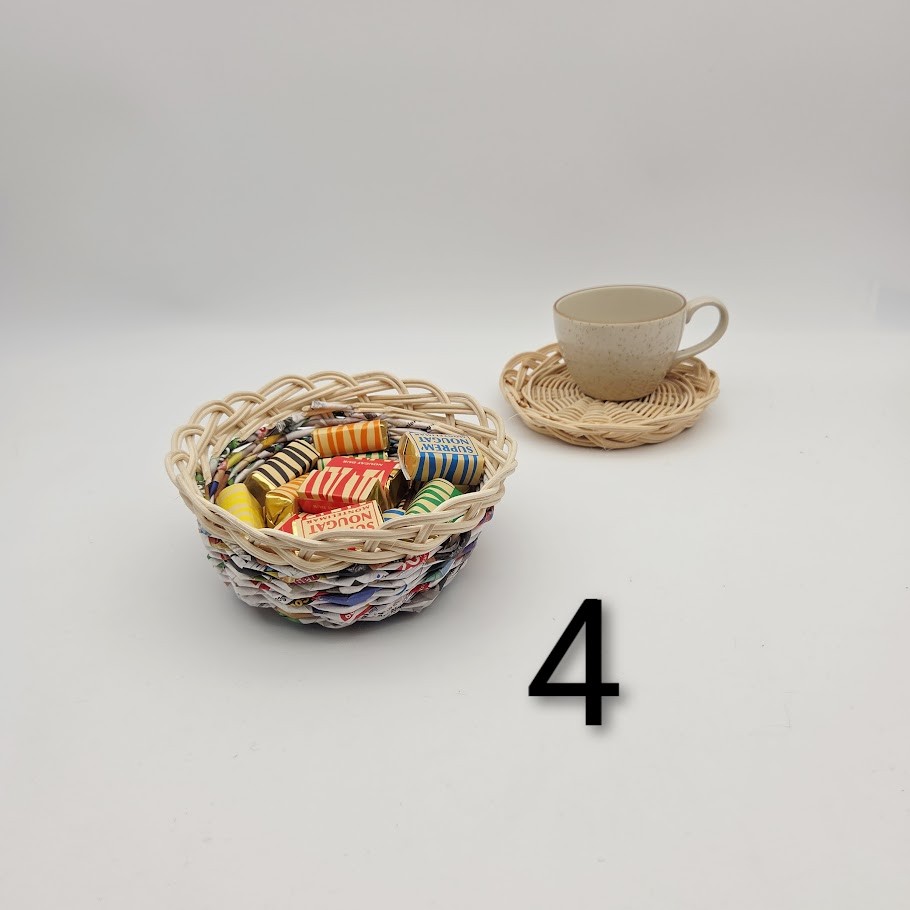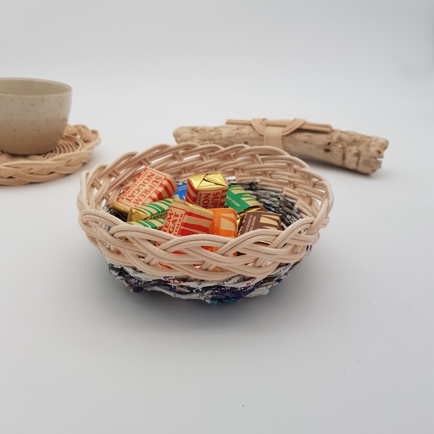 Ces vide-poche sont fabriqués en rotin naturel écru et papier magazine recyclé
