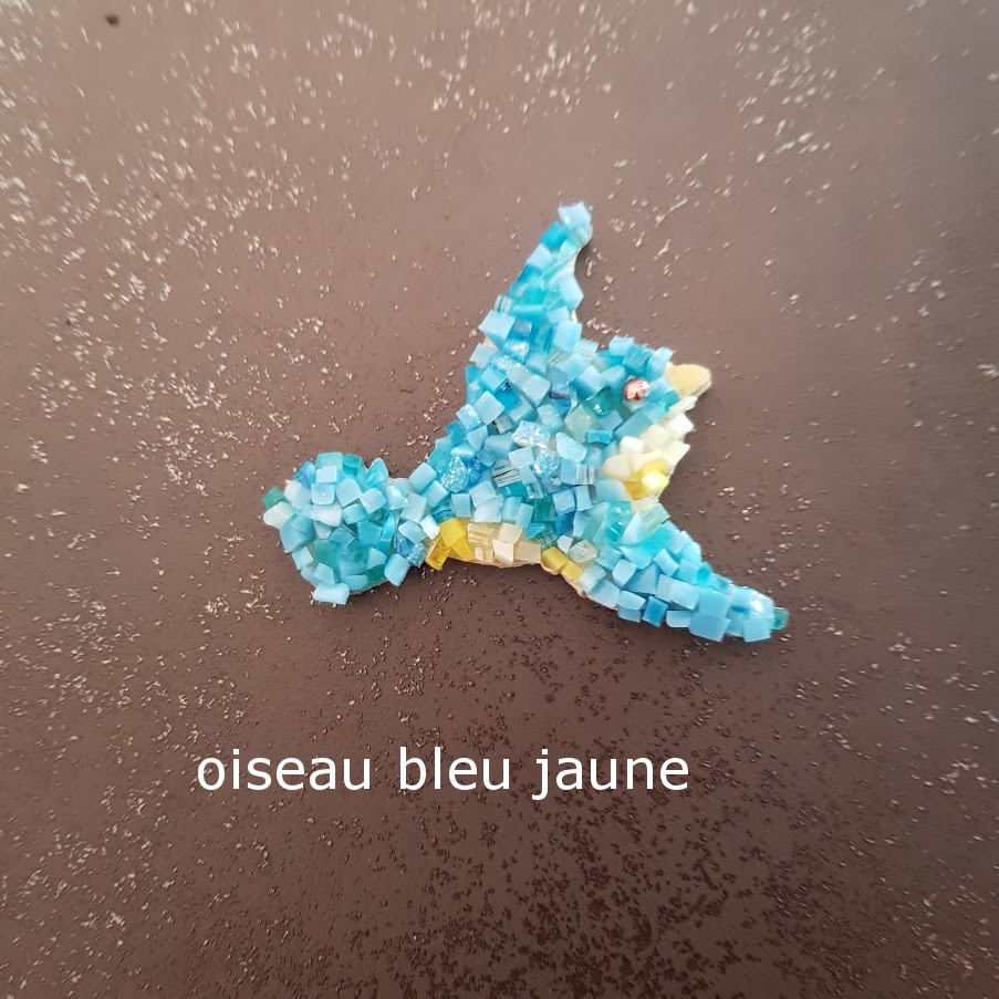oiseau bleu jaune : +/- 8 x 8 cm