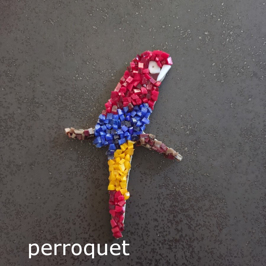 Magnets - aimants de réfrigérateur - oiseaux - colombe - perroquet - en mosaïque verre, coquillages, céramique, pâtes de verre et pierre - support bois