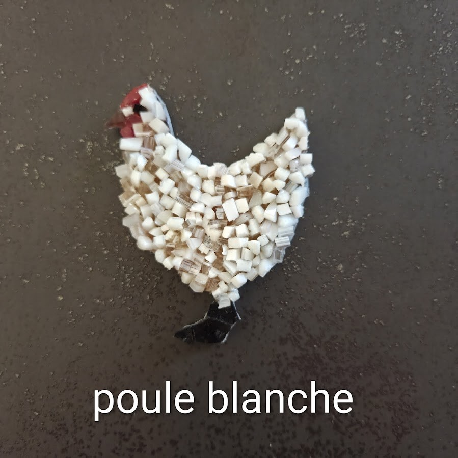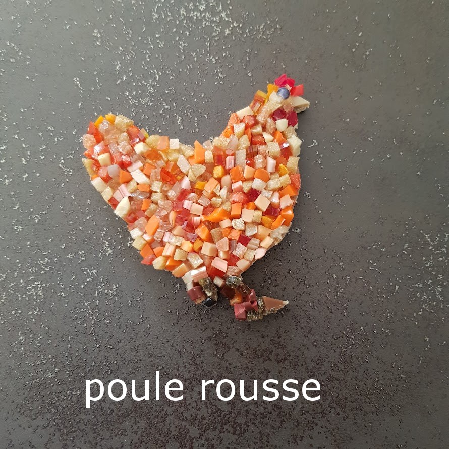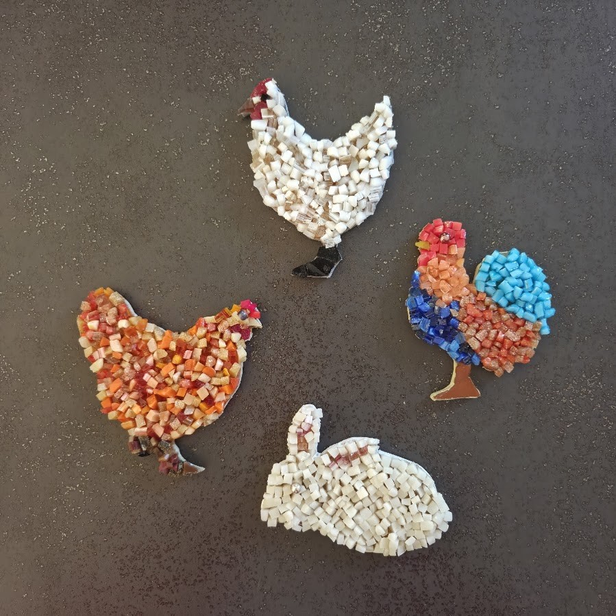 Magnets - aimants de réfrigérateur -basse-cour - poules - coq lapin - en mosaïque verre et pâtes de verre sur support bois