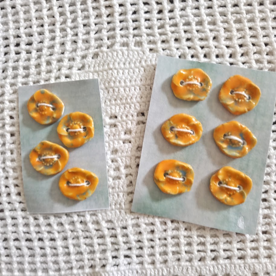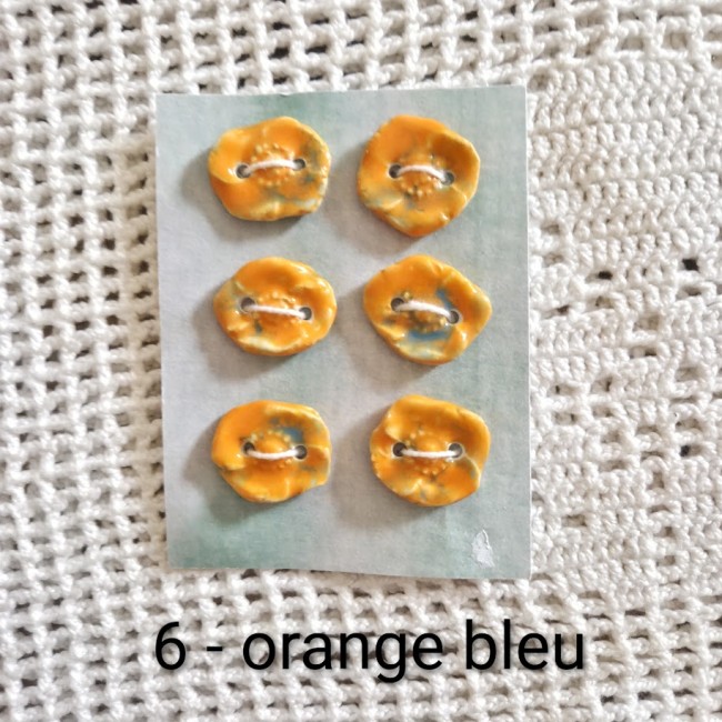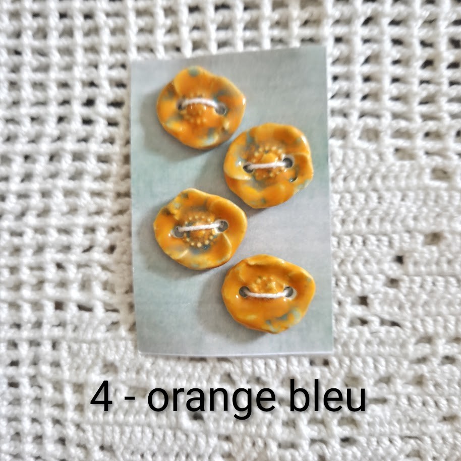Ces lots de 4 ou 6 boutons à coudre décoratifs orange bleus en forme de coquelicot - 2 trous - sont en céramique faience. Ils sont fabriqués et émaillés entièrement par mes soins - vendus par lot