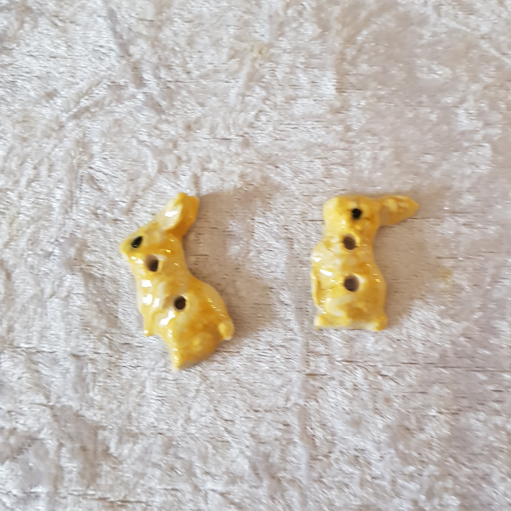 Ces boutons décoratifs lapins jaunes sont en céramique faience. . Ils sont fabriqués et émaillés entièrement par mes soins