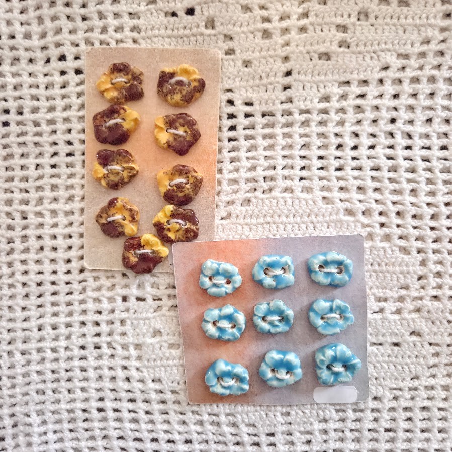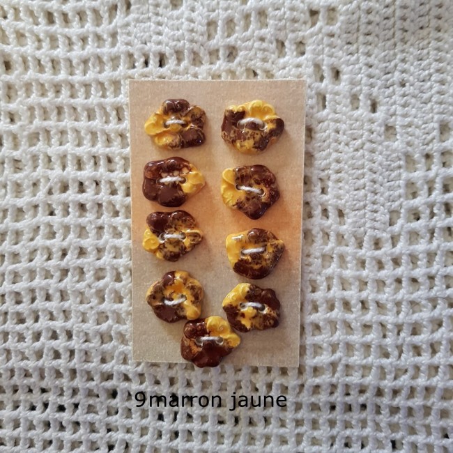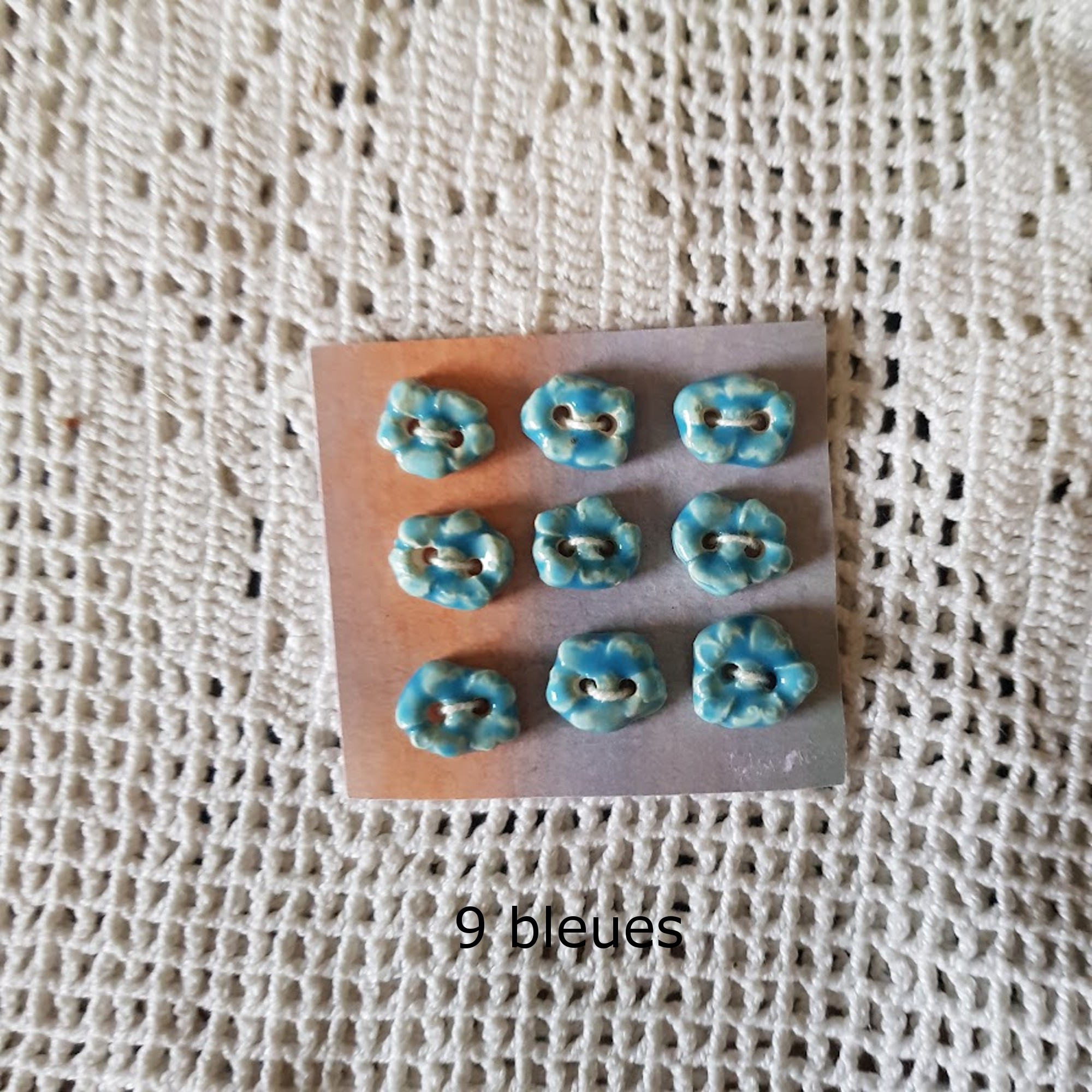 Ces boutons décoratifs à coudre en forme de fleurs bleues ou marron jaune sont en céramique faience. Ils sont fabriqués et émaillés entièrement par mes soins. Ils sont vendus par lot