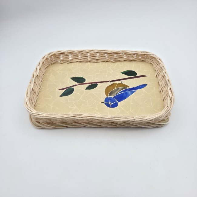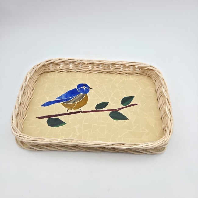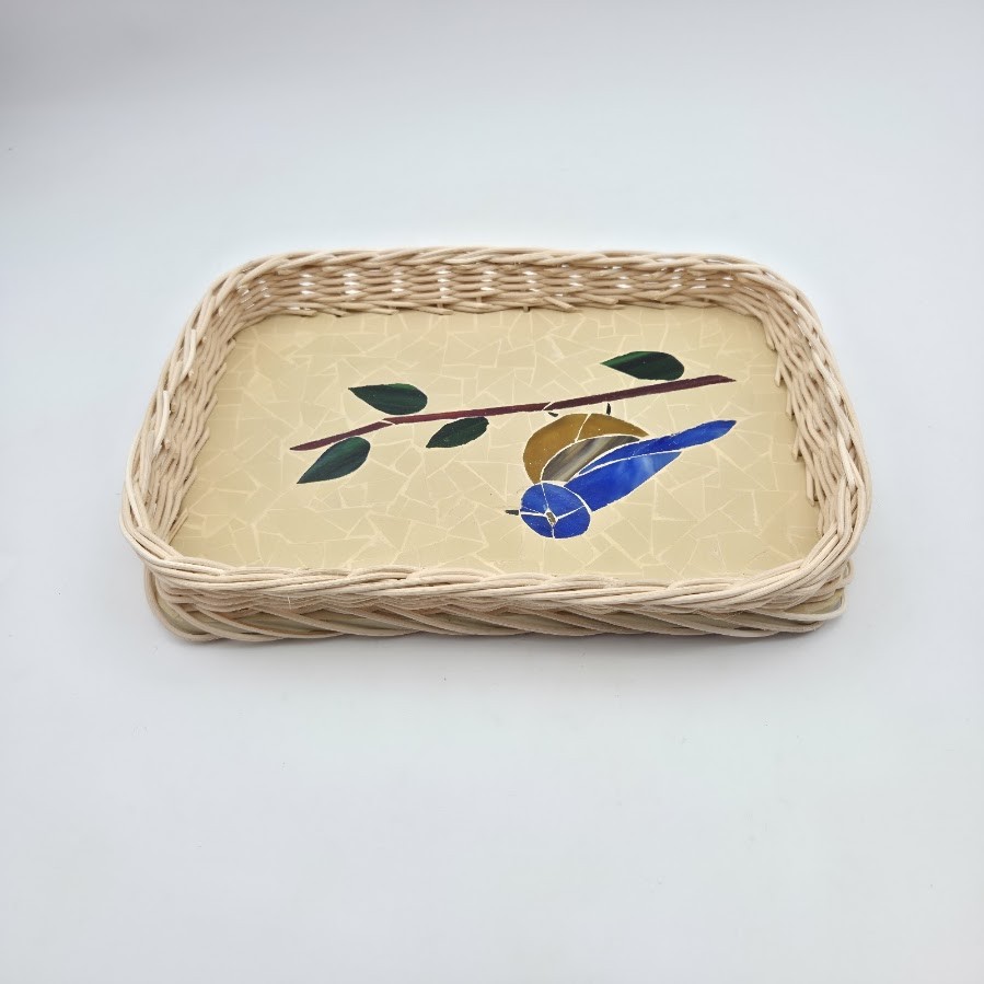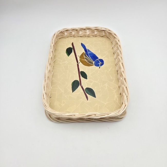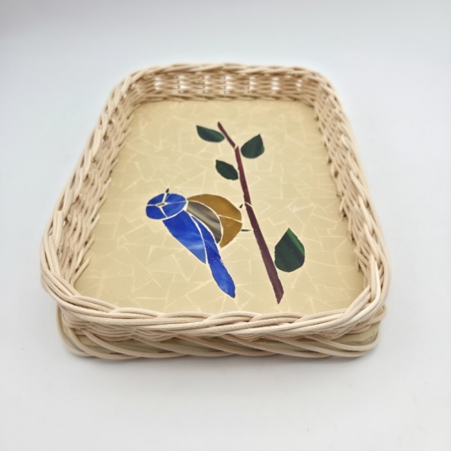Le fond de ce plateau est une mosaïque représentant un oiseau sur sa branche sur un support bois. Le bord est tressé en rotin naturel écru