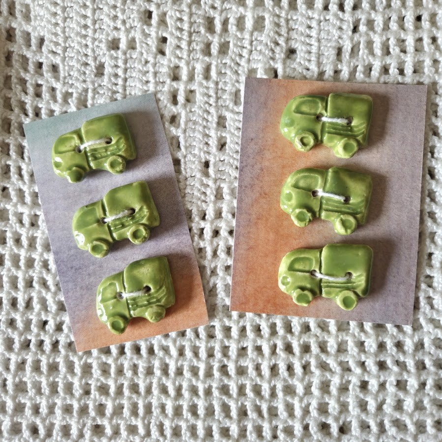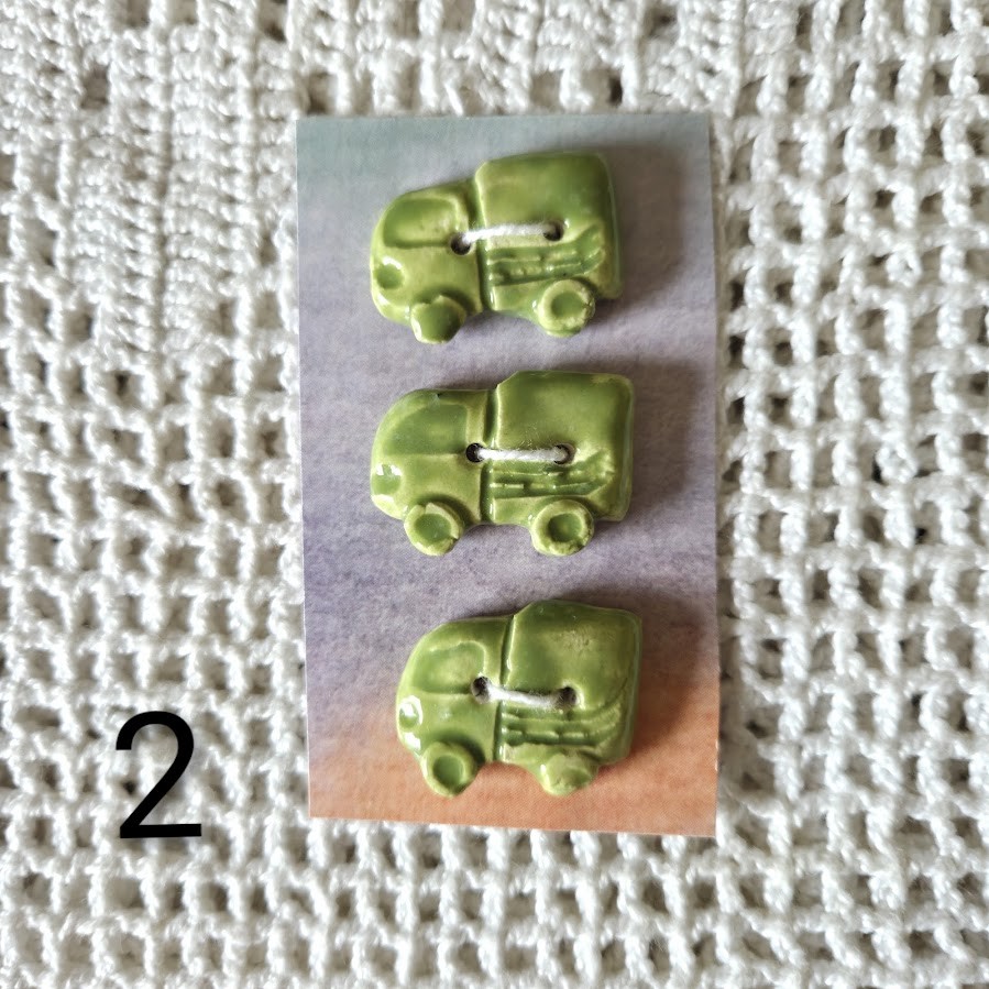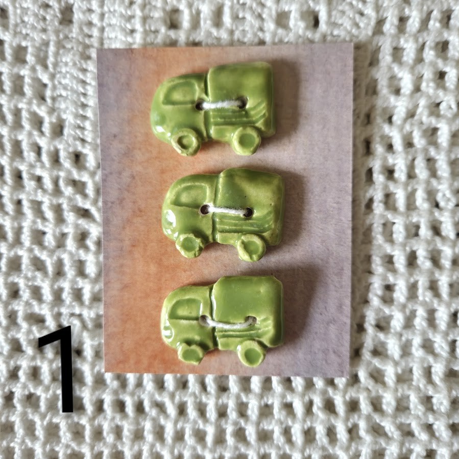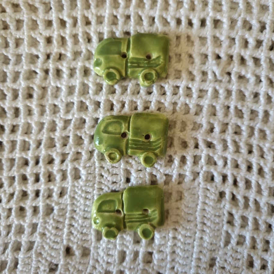 Ces boutons décoratifs à coudre en forme de camions verts sont en céramique faience. Ils sont fabriqués et émaillés entièrement par mes soins. Ils sont vendus par lots