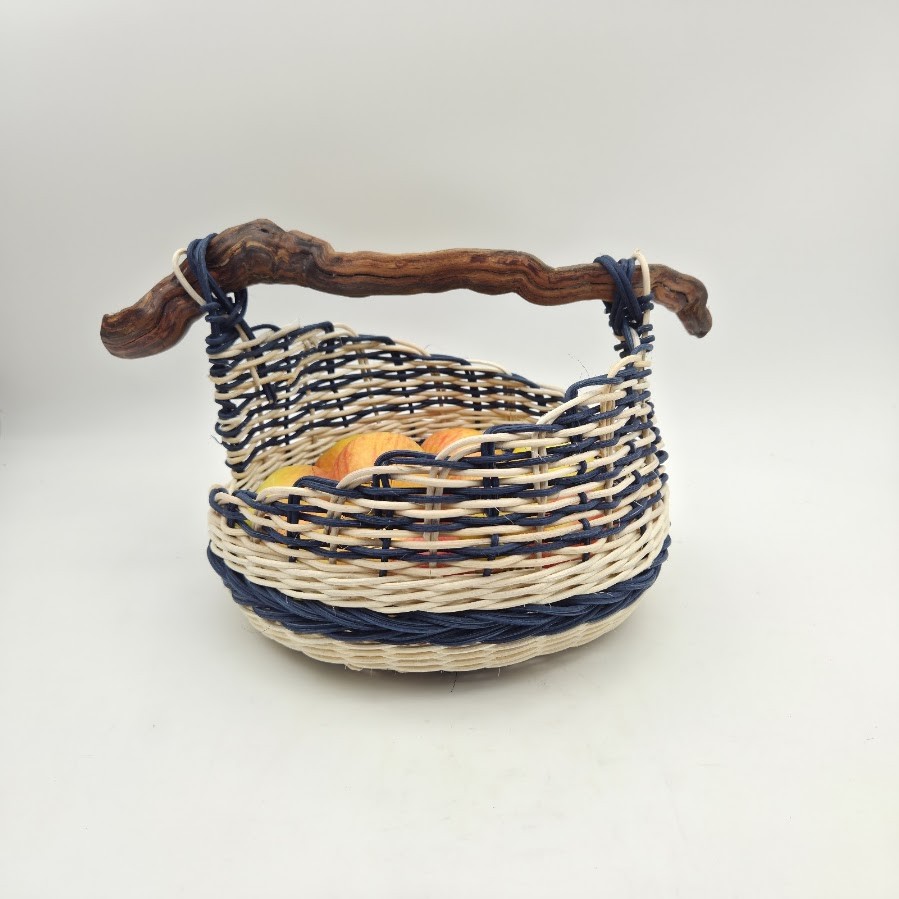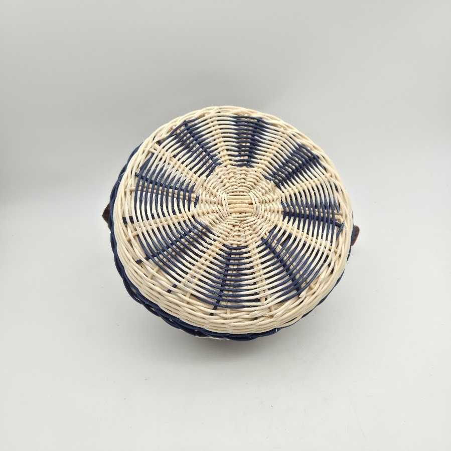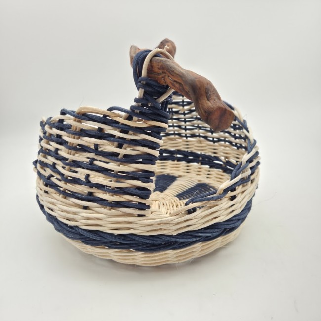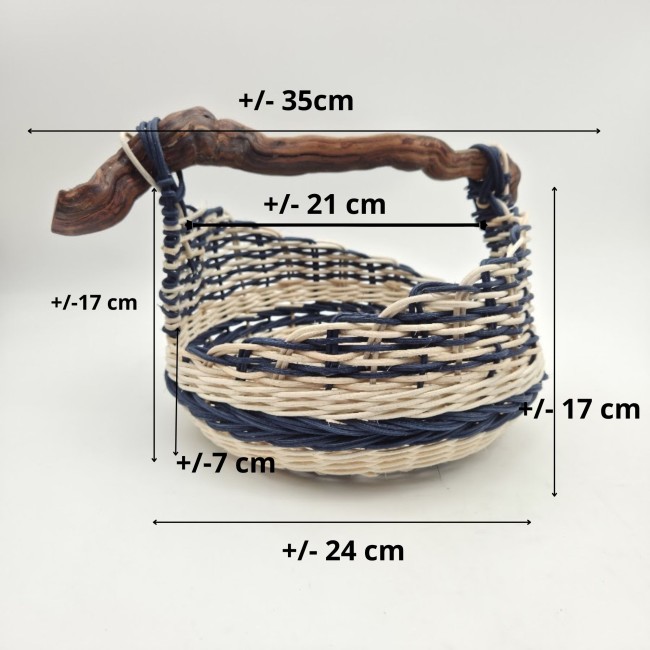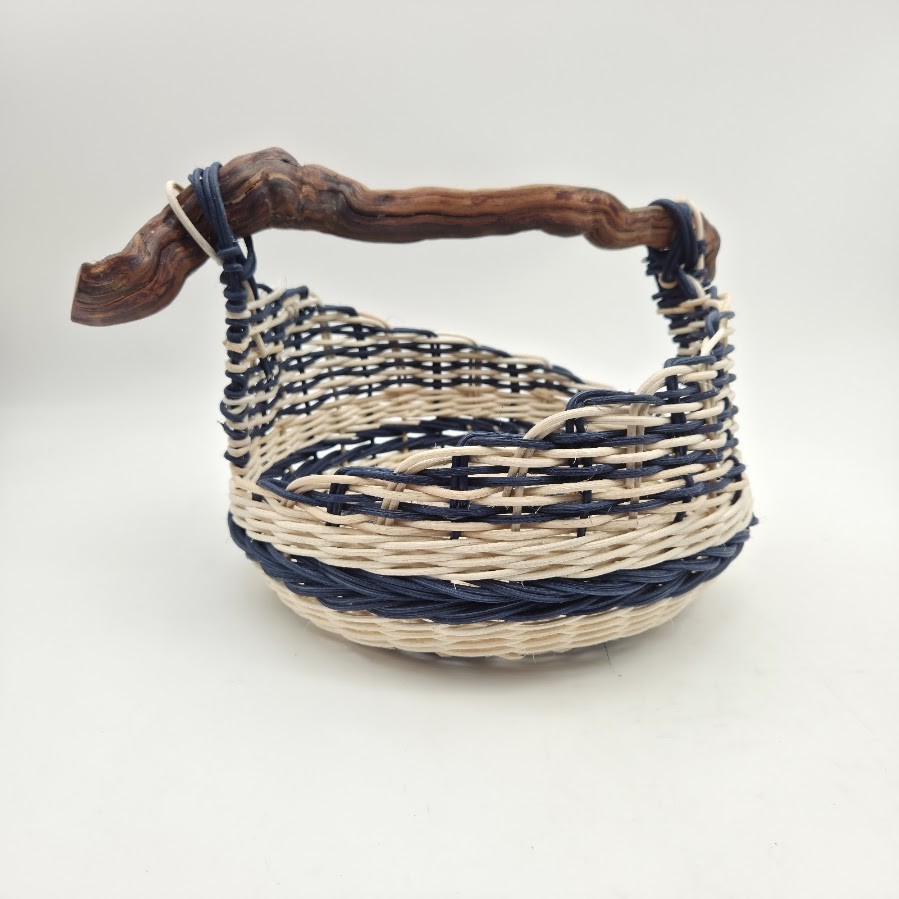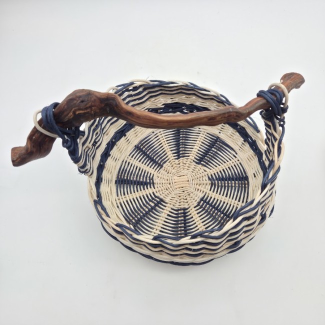 Panier asymétrique rond bleu marine et écru en rotin naturel - anse bois racine de vigne - entièrement tressé à la main.